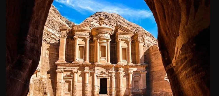 The Petra, an ancient city carved into rose-red cliffs, features a treasury facade. Which country?
