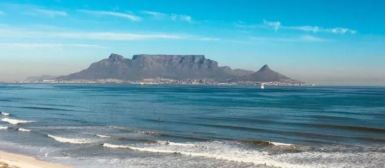 Which city overlooks Table Mountain and a lively waterfront?