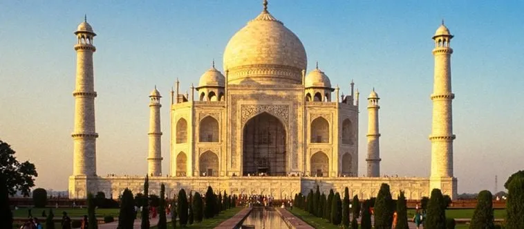 Which city glows with Taj Mahal at dawn?